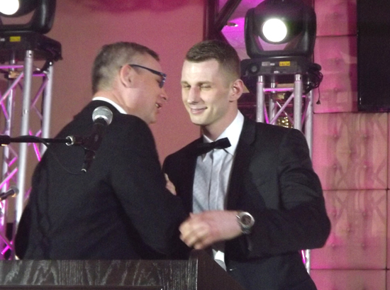 Przemek Garczarczyk przekazuje statuetke Polonus Roku Andrzejowi Fonfarze