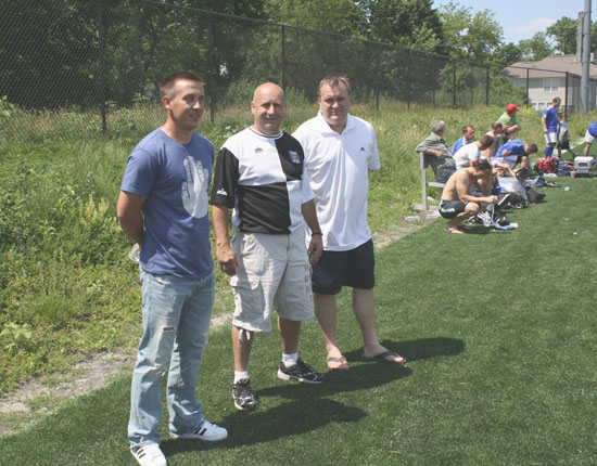Wiesław Augustyn zdobywa piątą  bramkęOd lewej: drugi trener Tomek Duniec, trener Tadeusz Ciężki i prezes Capitolu Czarnych Jasło – Czesław Koszyk podczas wczorajszego meczu