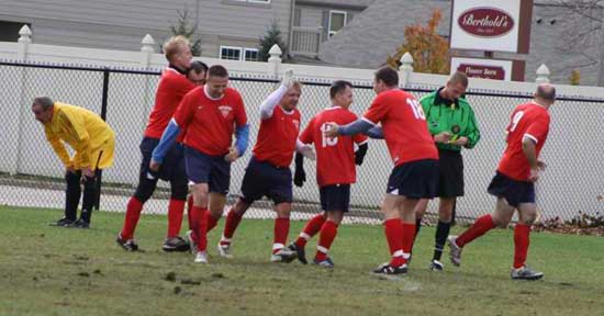 11-13-11-090Gratulacje dla Strzesaka po zdobyciu przez niego bramki