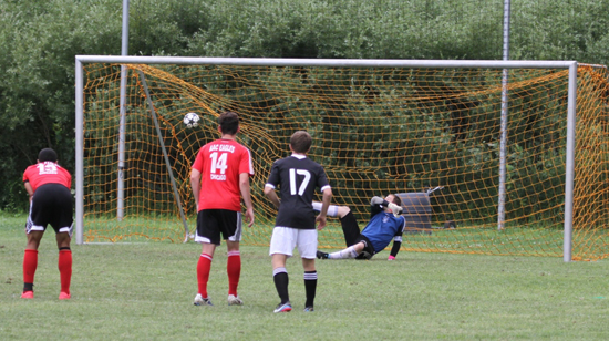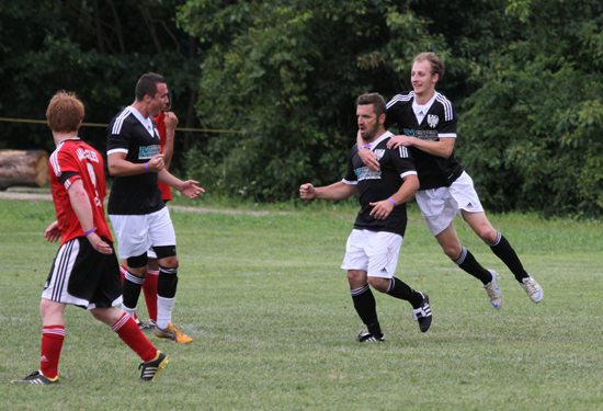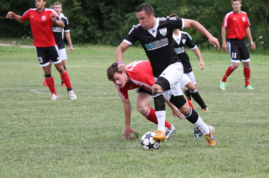 W finale: Czarni Jasło – Eagles najpierw faul w polu karnym na Łukaszu Klusce (powyżej), później bramka z karnego uzyskana przez poszkodowanego i radośc zdobywcy bramki (poniżej)