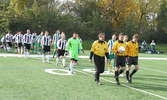Andrzej Nowak (Metal) wyprowadza oba zespoły, po jego prawej ręce inny znany, b. piłkarz, a obecnie sędzia – Janusz Kieca