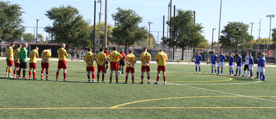 Przed spotkaniem minutą ciszy uczczono pamięc zmarłego ostanio b. prezesa Ligi – Jacka Latuszka – A tak padła pierwsza bramka w meczu ze strzału Adriana Golemo (pierwszy z prawej)