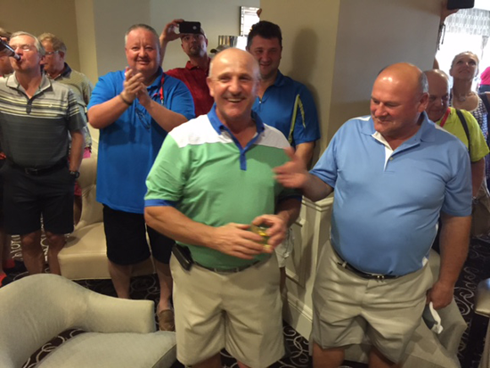 Stanisław Lukanus z Podhala Golf Club obchodził w trakcie turnieju swoje urodziny – na zdjęciu przyjmuje życzenia od kolegów