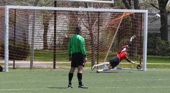Drugi rzut karny dla Stali i znowu pudło – piłka odbija sę od spojenia słupka z poprzeczką i wychodzi w pole. A poniżej – jeszcze jeden obrazek ze spotkania Stali z Igloopolem Foto – Jacek Jówko