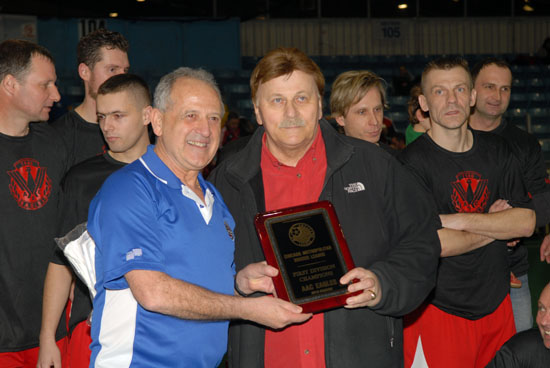 Tuż po ceremonii wręczenia trofeum dla triumfatorów – zespołów Eagles. Od lewej stoją; Bogdan Żurowski, Darek Szewczyk, Krzysztof Kulis, Prezes Ligi Steve Siomos i wiceprezes Eagles, twórca zespołu Eagles B – Stan Makówka, Jacek Lechowicz, Jacek Wiszniewski i Marek Kruczek Foto – Andrzej Baraniak