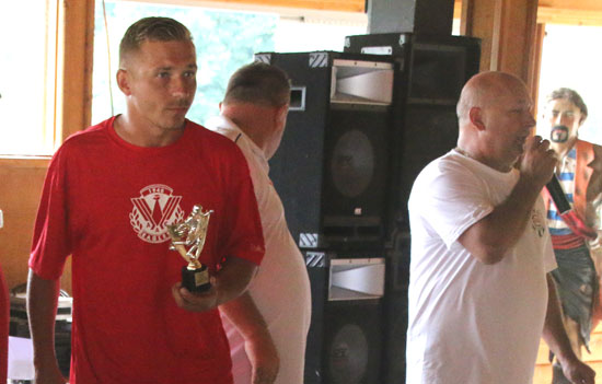 Najlepszy strzelec – Kuba Piotrowski z trofeum, obok organizator Czesław Koszyk