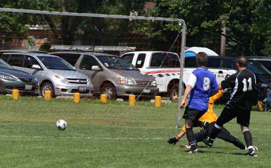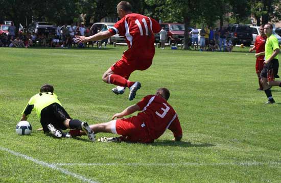 Tak się zaczęło i tak skończyło. Powyżej – Marek Wiśniewski zdobywa pierwszą bramkę dla Działaczy i ponizej – tensam zawodnik ustala wynik na 4-2 Foto – Jacek Jówko