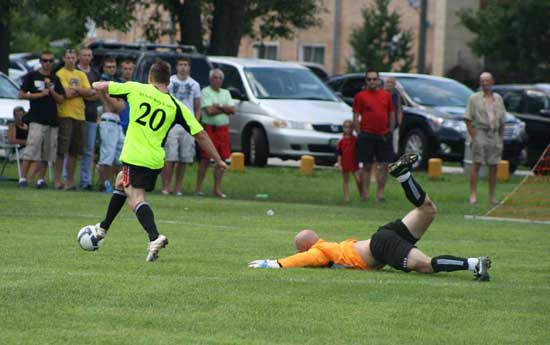 Moglo być 3-1 – Krystian Ustupski minął bramkarza Wojtka Siwika, ale zmiast podać do nieobstawionego Mariusza Kawęckiego, próbowal strzelić z b. ostrego kata Foto – Jacek Jówko