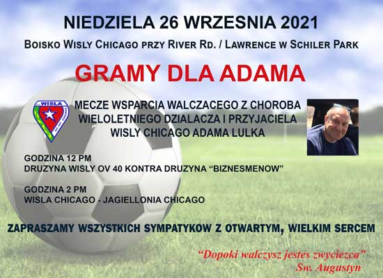 Pod takim hasłem dojdzie w najbliższą niedzielę 26 września na obiekcie Wisły przy River Rd do spotkania sympatyków polonijnej piłki, podczas którego będziemy kwestować na pomoc dla walczącego z poważna chorobą, związanego z Wisłą od lat działacza, kierownika pierwszej drużyny -, ADAMA LULKA.