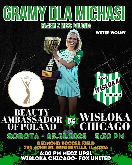 Na murawie zmierzą się reprezentacja Wisłoki Chicago oraz zespół złożony z finalistek Beauty Ambassador of Poland. To nie będzie zwykły mecz – to wspólne święto pomocy i solidarności! Celem wydarzenia jest wsparcie leczenia Michasi. Dlatego liczymy na Twoją obecność i dobre serce. Dołącz do nas w sobotnie popołudnie, adres; Redmond Complex 700 John St. Bensenville.