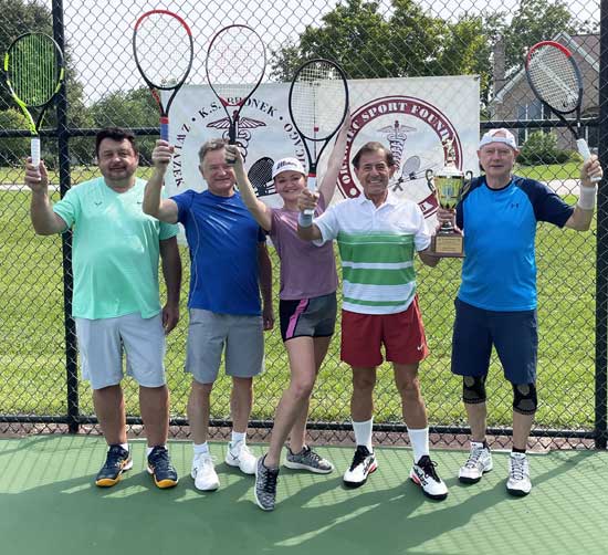 Triumfatorzy Mistrzostw Klubu „Tatry” w Tenisie Ziemnym 2022 z pucharami. Od lewej: W. Podlipni, D. Szamocki, H. Kosiński, B. Orawiec (organizator), S. Orawiec, A. Harmata.