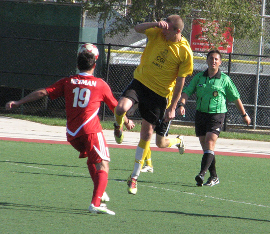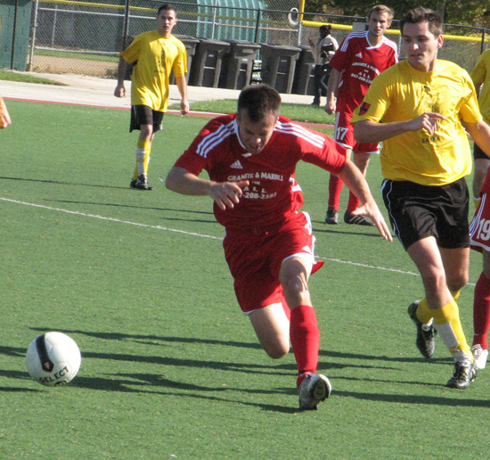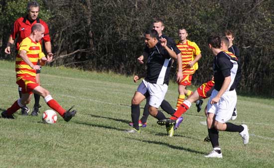 \Piotr Polak (z prawej) jeszcze w grze. Za moment otrzyma drugą żółta kartkę – z meczu Dabrovi z Hetmanem 3-1 Foto – Wiesław Książek