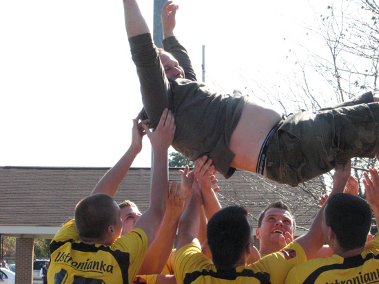 Po zakończeniu zwycięskiego meczu Dabrovii Ustronianki – współzałożyciel, prezes i sponsor Dabrovii – Marcin Tabor podrzucany do góry Foto – Wiesław Książek