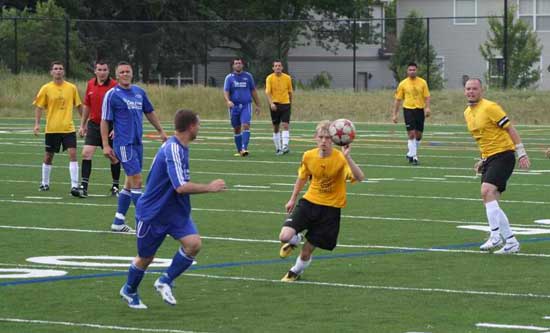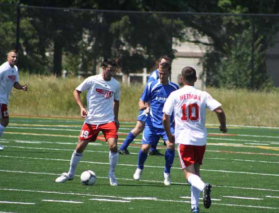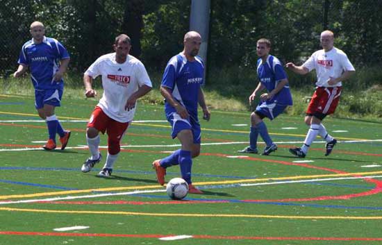 W najciekawszym pojedynku w gr. A Polonez zremisował 3-3 z Dąbrovia Ustronianką. Remis na pewno szczęśliwy dla Poloneza, który jeszcze na 15 min przed końcem przegrywał 1-3, ale druga żółta kartka dla Piotra Polaka spowodowała osłabienie liczbowe Dąbrovii w ostatnich minutach i ułatwiła Polonezowi zdobycie dwóch bramek. Ten remis oznacza, że pierwsze miejsce w grupie zajęła Jagiellonia, która bez problemu uporała się z grającą w 9-osobowym składzie (w tym upale) Lechią. W ten sposób już w półfinale dojdzie do chyba przedwczesnego finału, spotkają się bowiem Iglooool z Polonezem (środa, Bensenville, godz. 8 p.m.); w drugim półfinale zagrają Jagellonia z Hetmanem (Bensenville. wtorek lub czwartek, godz. 8 p.m.).