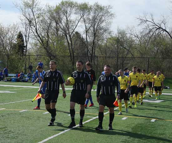 Tak się zaczęło. Sedziowie – Andrzej Nowak w asyście Roberta Juszczyka i Wojtka Myrdy wyprowadzają zespoły Dąbrovii i Hetmana do inaugurującego wiosenny sezon spotkania; poniżej – obie drużyny uczciły minutą ciszy pamięć zmarłego ostatnio sędziego i działacza –  Andrzeja De Virion.