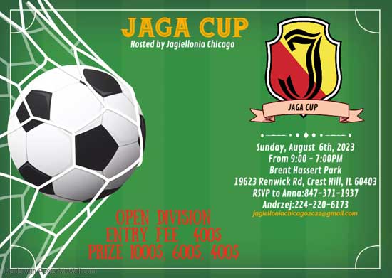 Jak już informowaliśmy, w najbliższą niedzielę 6 sierpnia w Romeoville, na boiskach, gdzie swoje mecze rozgrywa Sling TV Liga Podhalanska, odbędzie się turniej „Jaga Cup” . Organizatorem jest KS Jagiellonia Chiicago z prezesem Andrzejem Mankowskim. W szrankach stanie 8 zespołów, które podzielono na dwie grupy.