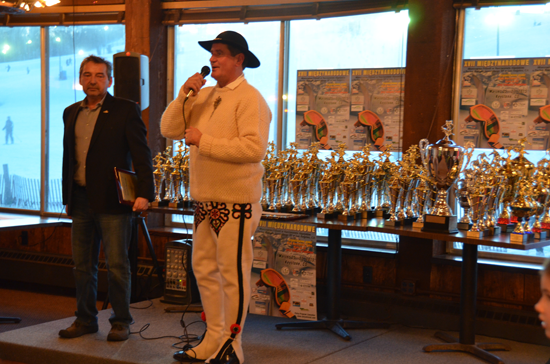 Prezes ZPAP Józef Cikowski gratuluje uczestnikom podczas ceremonii rozdania nagród. Obok prezes TATRY Ski Club Piotr Chowaniec