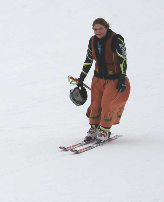 Renata Staszel podczas pokazowego przejazdu s góalskim stroju narciarskim