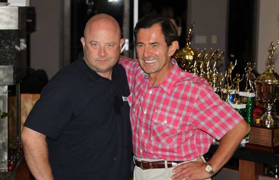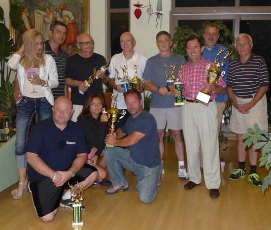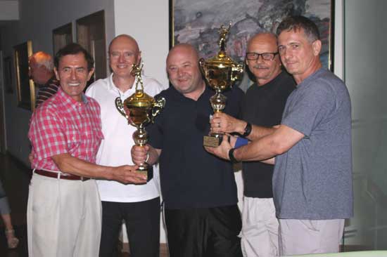 Z drużynowymi pucharami. Od prawej: Piotr Włodarczyk, Andrzej Moniuszko, Piotr Dąbrowski (kapitan drużyny „Dziennikarzy”), Janusz Dańko, Bronisław Orawiec (kapitan drużyny „Lekarzy”)