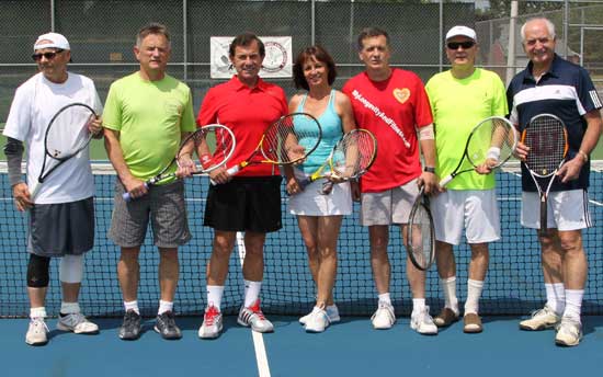 Rakiety Klubu Sportowego „Bronek” ZLP w Chicago przed grami singlowymi. Od lewej: Andrzej Moniuszko, Janusz Dańko, Bronisław Orawiec, Halina Anioł, Piotr Włodarczyk, Roman Marszałek, Marek Rudnicki