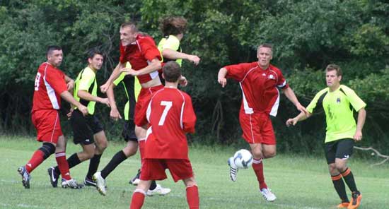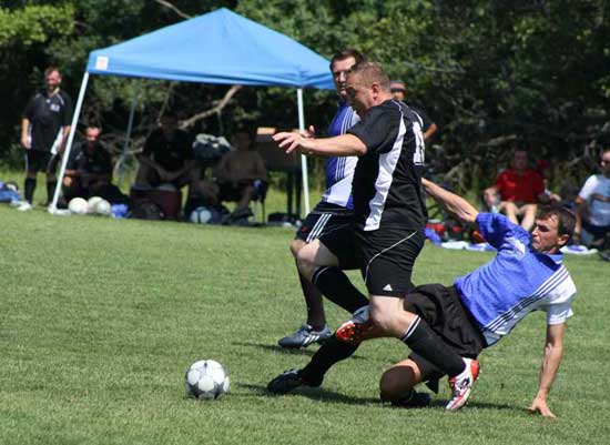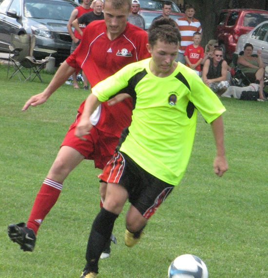 W przedmeczu Działacze pokonali Sedziów 4-2. Na zdjęciu Sebastian Mielcarek jak za najlepszych swoich lat przedziera się przez sedziowska obrone; usiłuje mu przeszkodzić Piotr Fornalik