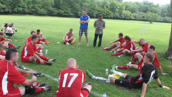 Trener Ligi Podhalańskiej Bogdan Zawadzki (w białym stroju) także miał pomysł jak rozegrać drugą połowe meczu…