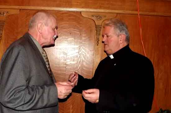 Były, wieloletni prezes Wisły – Józef Karkut i ks. Antoni Dziorek przełamują się opłatkiem