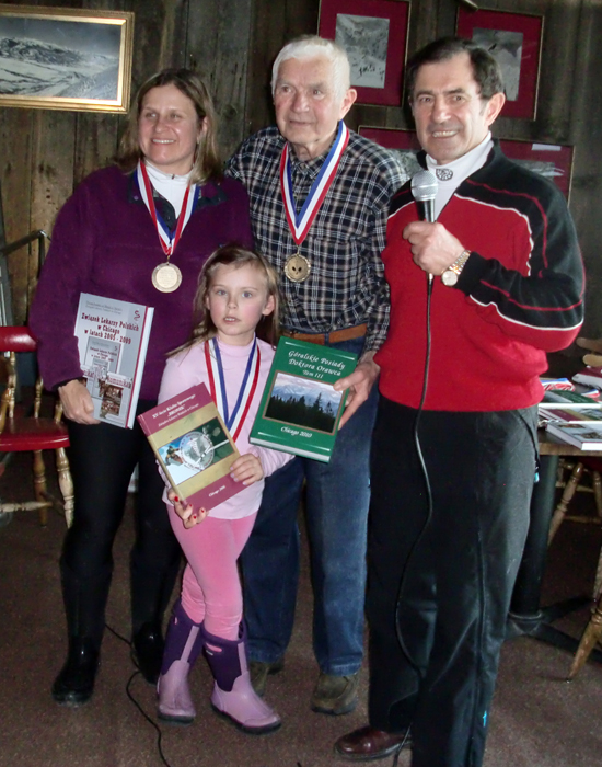 Podczas zakończenia. Od lewej: zwyciężczyni wśród grupy pań Irena Gula, najmłodsza uczestniczka Mistrzostw Julia Wykrętowicz, najstarszy uczestnik Julian Pawłowski z medalami oraz wręczonymi publikacjami przez B. Orawca (z prawej).