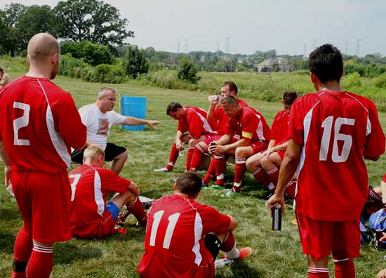 – Panowie, oni grają prostą piłkę. Tu się nie da inaczej grać. Pograć piłą, tak jak w ostanich15 minutach pierwszej połowy. Bliżej d nich dojść. Obrońcy musza kryć. Panowie, głowy do góry, gramy dalej. Tutaj nje da się „holować” piłki, trzeba grać pierwszą piłką. Boczni pomocnicy – szeroko. Trochę więcej zaangażowania. Jesteśmy w stanie to wygrać Jak oni strzelili tzy bramki, to dlaczego my nie możemy odpowiedzieć także trzeba bramkami?