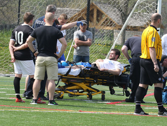 Mateusz Lewandowski na noszach przd odwieziniem do szpitala Fot – Jaccek Jówko