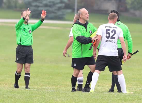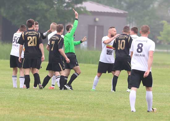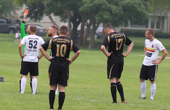 Tylko 30 minut trwał zapowiadający się bardzo ciekawie pojedynek lidera w Pre-mier Soccer League Czarnych Jasło z Jagiellonia. Pry stanie 0-0 po otrzymaniu dwóch czerwonych kartek, niezadowolona z decyzji sędziego Jagiellonia opuściła murawę. Tak więc będzie raczej na pewno  walkower dla lidera, który umocni się na prowadzeniu.  Po dobrej grze Unia Chicago przerwała nienajlepszą ostatiop passę wygrywając z SHogun win. Nareszcie – po deszczowej serii –oddane zostalo do uztku pilkarom boisko Wisły  przy River Rd/ Inauguracja sezonu na wiślackim obiekcie była w pełni udana. Potwierdziło się, że piłkarze Wisły dobrze czują się na swoim, szerokim i długim boisku. Podobnoilepiej niż na sztucznej trawie w Olympic Park. Oto szczególy