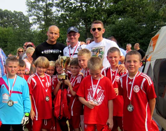 Na zdjęciu zwycieski zespół Eagles u-10, a z tyłu jego trener Tomek Drążek w objęciach mistrzów boksu – Artura Szpilki i Andrzeja Fonfary