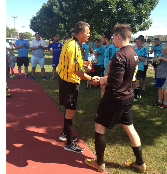 Puchar dla Odrowążą odbiera z rąk Zdzisława Kujawy bramkarz Kostek Kawęcki