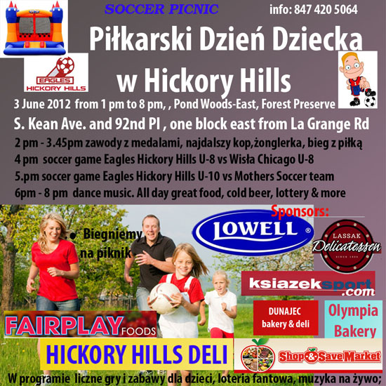 Pierwszy dzień czerwca to tradycyjnie w Polsce dzień Dziecka. Rodzice oraz trenerzy nowo powstałej drużyny Orzełki Hickory Hills zapraszają do wspólnego celebrowania tego wyjątkowego dnia w roku na pikniku, który odbędzie się 3 czerwca 2012 w Hickory Hills na leśnej polanie, Pond Woods-East, S. Kean Ave. and 92nd Pl, tylko jeden block na wschód od La Grange, między W. 87 St a W.95th St