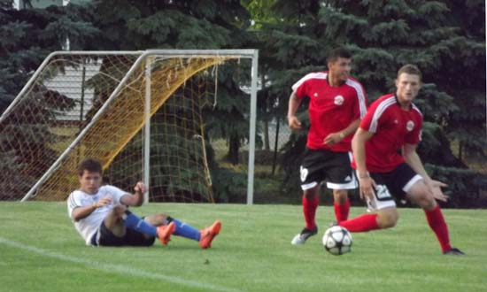 Piotr Śliwa ratuje przed utratą kolejnej bramki – napastnik Schwaben (nr 9) był przed momentem w sytuacji “sam na sam”