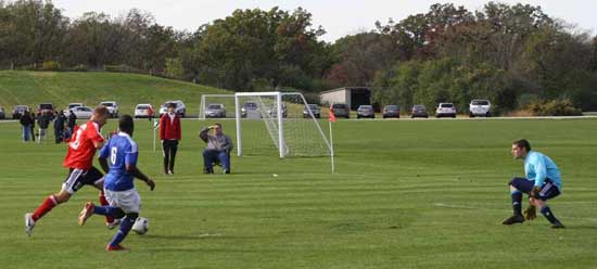 10-16-11-079Kuba Piotrowski wygrywa pojedynek  “jeden na jeden” i za moment strzeli obok bramkarza do siatki Schwaben            Foto – Jacek Jówko