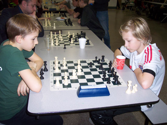 Mistrz klas 6-8 Krzysiu Góra (po prawej) z oponentem