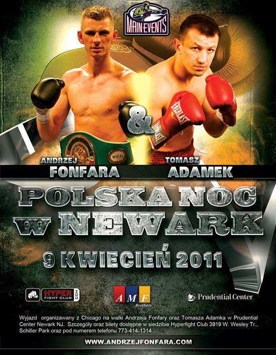 hicagowski pięściarz Polski Książe -Andrzej Fonfara (16-KO 7)- lost 2 (KO 1)- 19), który 9 kwietnia na gali Tomasza Adamka w hali Prudential Center w Newark, zmierzy się z pochodzącym ze stanu Arkansas Ray Smith (9-KO 3- lost 5(KO 3)- 14. przygotowuje się do tego pojedynku pod okiem swego szkoleniowca Sama Colony w Chicago Boxing Club w Wietrznym Mieście. Polski pięściarz nie zapomniał także o swoich fanach z Chicago, których ma co raz więcej.