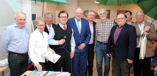 Sponsorzy Mistrzostw. Od lewej: Lech Poloński, Danuta Kostecki, Jerzy Kękuś, Bronisław Orawiec (z mikrofonem), Jan Gniadek, Stanisław Bafia, Janusz Kasina, Bogdan Miłek, Wiesław Jabłoński, Bodo Mikulla. Kleinwalsertal, Austria. 23 marca 2018 r.