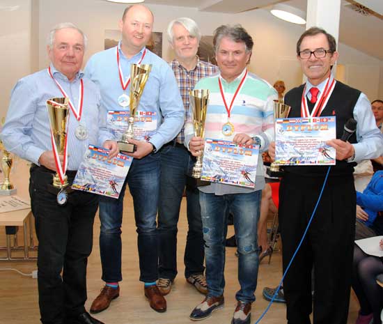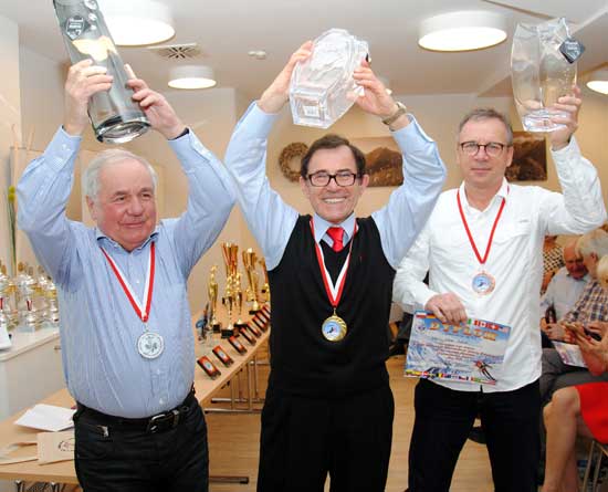 Najlepsi panowie lekarze wg przelicznika FIS. Od lewej: Lech Poloński (II miejsce, Polska), Bronisław Orawiec (I miejsce, USA), Adam Rybicki (III miejsce, Szwajcaria. Aparthotel. Kleinwalsertal. 23 marca 2018 r