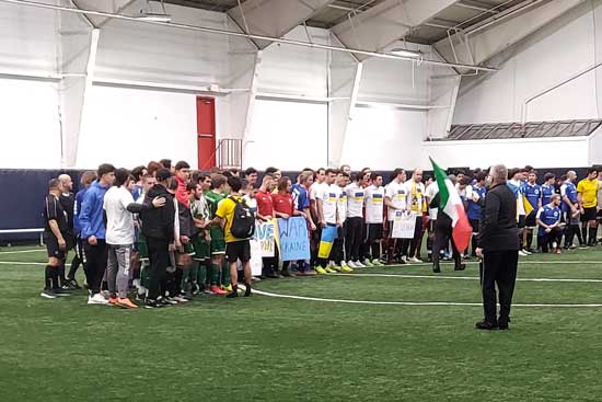 Przed spotkaniem Wisły z Hammers, w związku z agresją Rosji na Ukraine, prezydent Europa League – Gaetano Traversa w obecności drużyn odmówił krótką modlitwę za walczących w obronie Ojczyzny Ukrainców, odegrano także hymn Ukrainy. Foto – Wojtek Woźniak