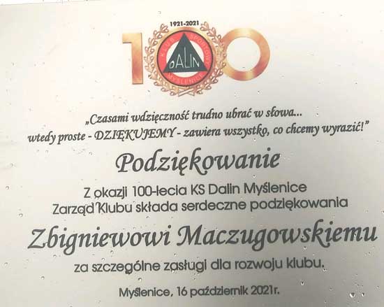 Podczas sobotniego Treningu Cracovii trener Zbigniew Maczugowski pochwalił się dyplomem, jaki otrzymał ostatnio od KS Dalin Myśłenice, gdzie przed laty był szkoleniowcem tego klubu.
