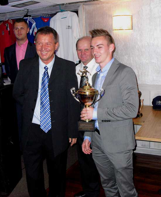 Zdzisław Kujawa wreczył w imieniu Polskiego Kolegium Sędziów podczas bankieytu XX-lecia Ligi Podhalańskiej nagrode fair play Dawidowi Zarebczanowi; w środku prezes ligi Tomek Grela Foto – Kuba Sidor